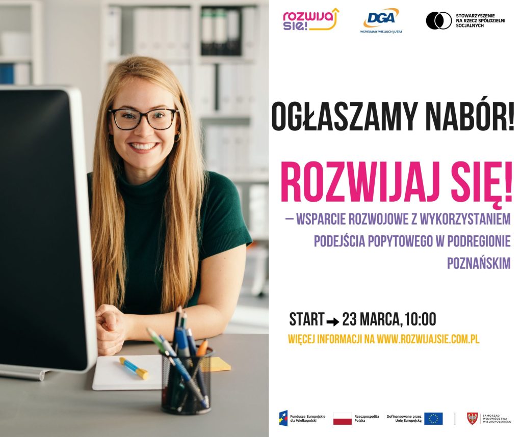 Jutro o 10.00 ruszy nabór do projektu „"Rozwijaj się II – wsparcie rozwojowe z wykorzystaniem podejścia popytowego w podregionie poznańskim", który potrwa do 27 marca! To idealna okazja, by zdobyć dofinansowanie na kursy, szkolenia i rozwój zawodowy.